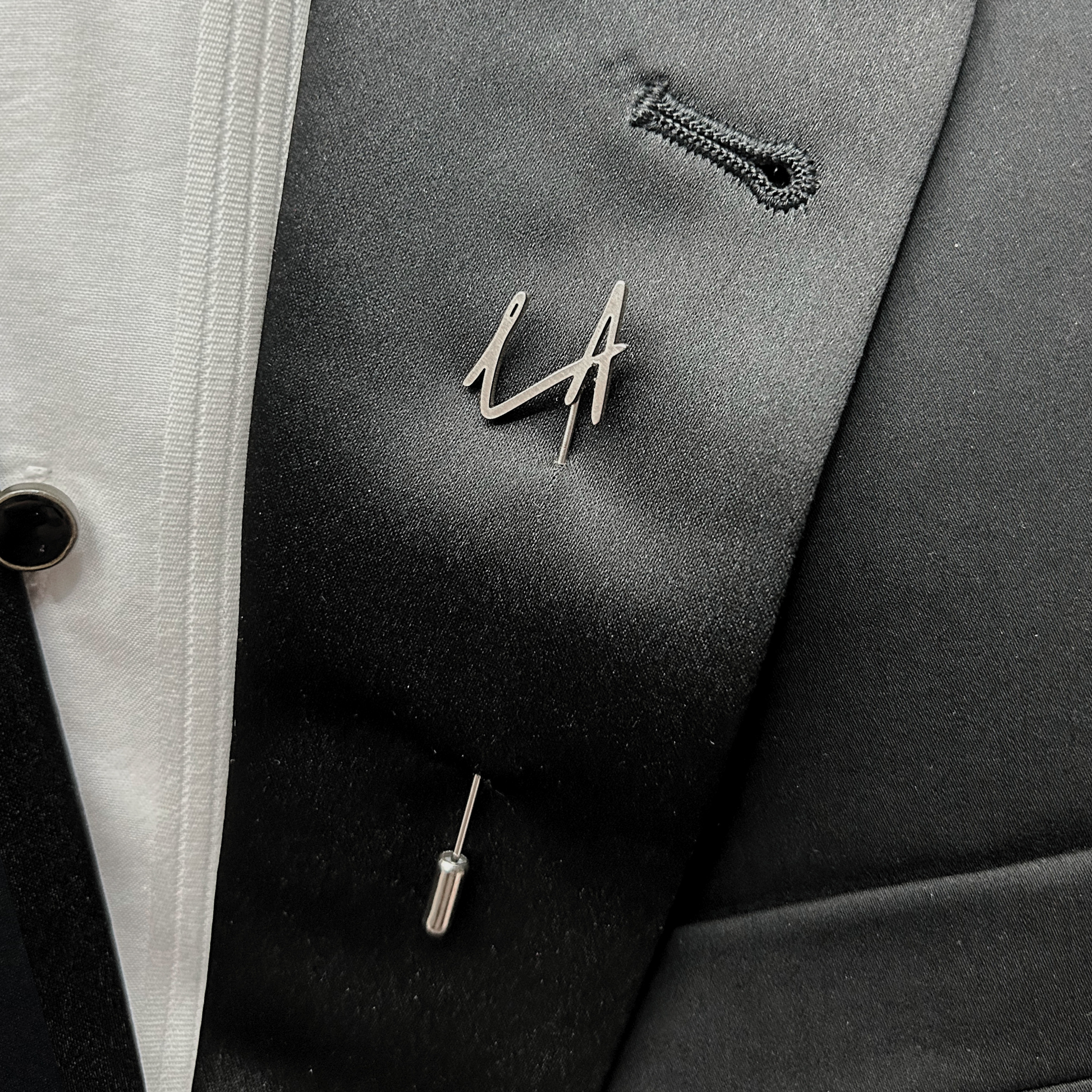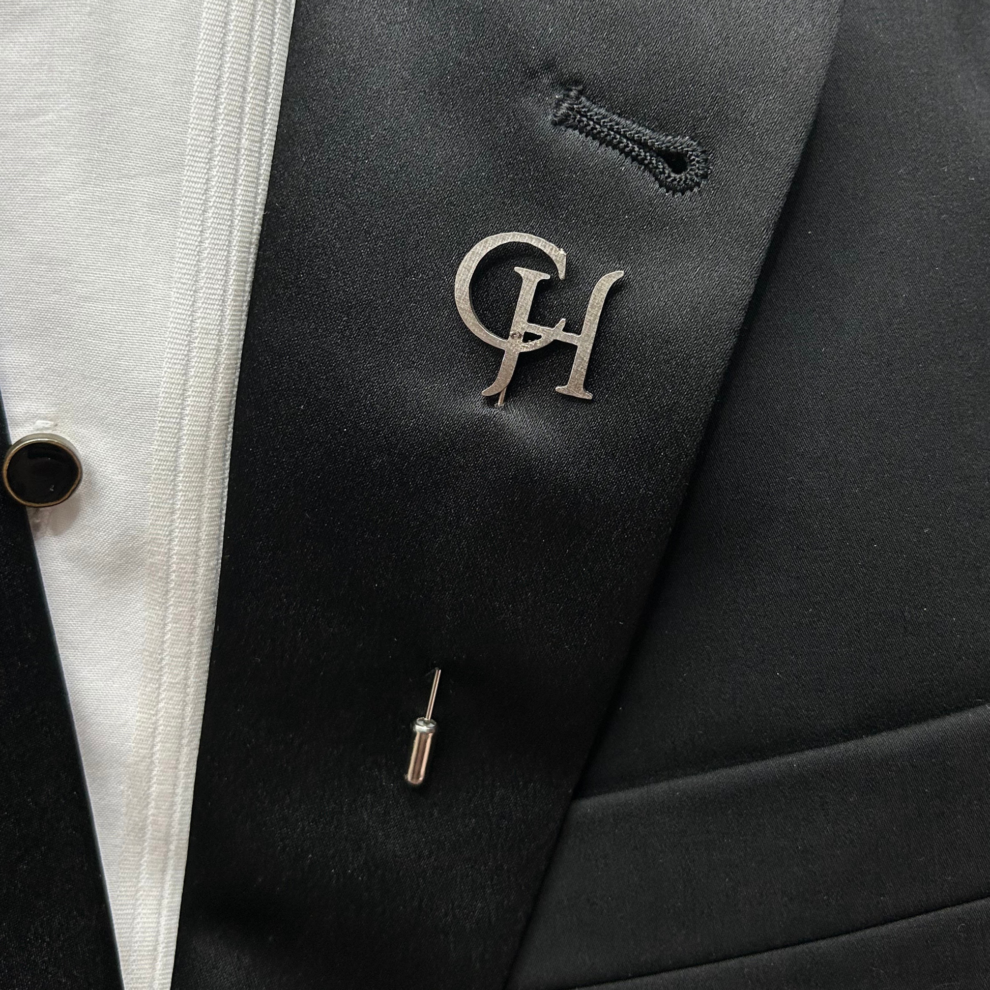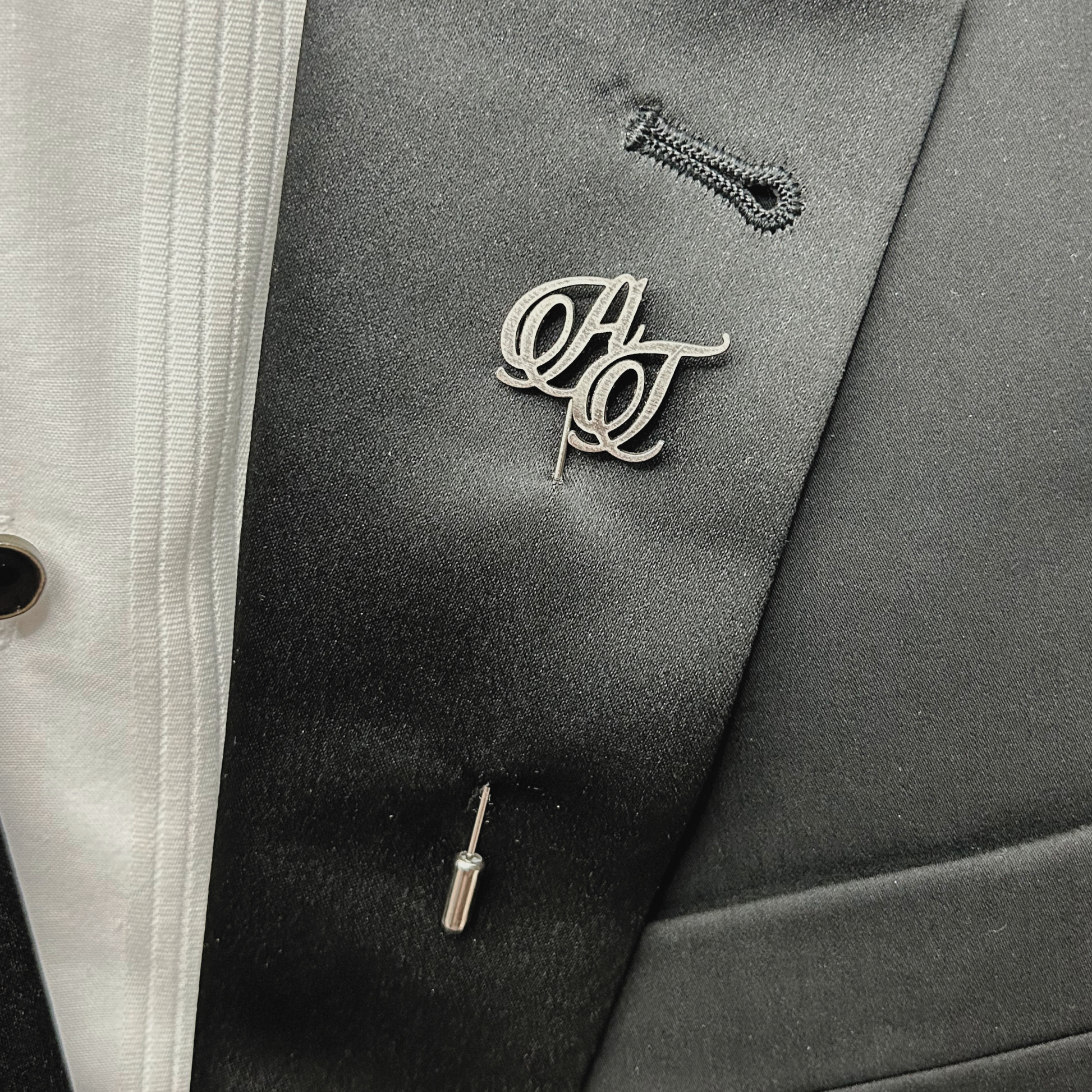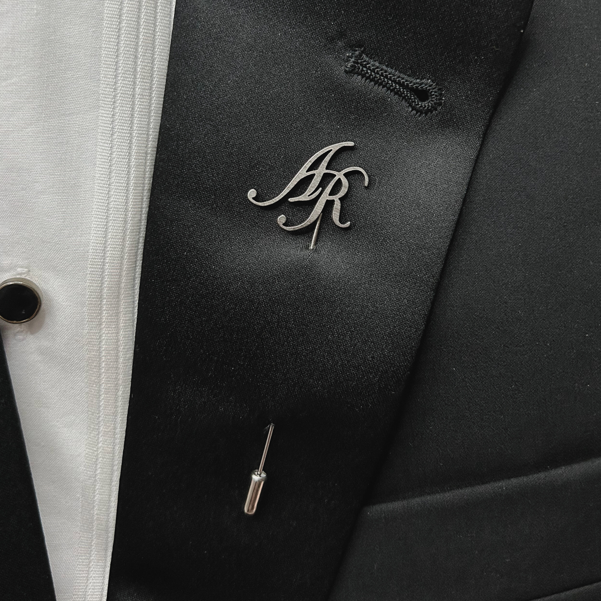 Elegante boutonnier de acero inoxidable, diseñado con corte láser de precisión. Perfecto para bodas y eventos formales. Personalízalo con las iniciales que desees.
