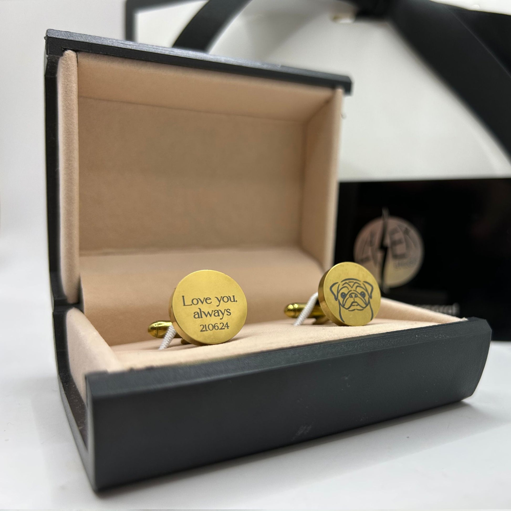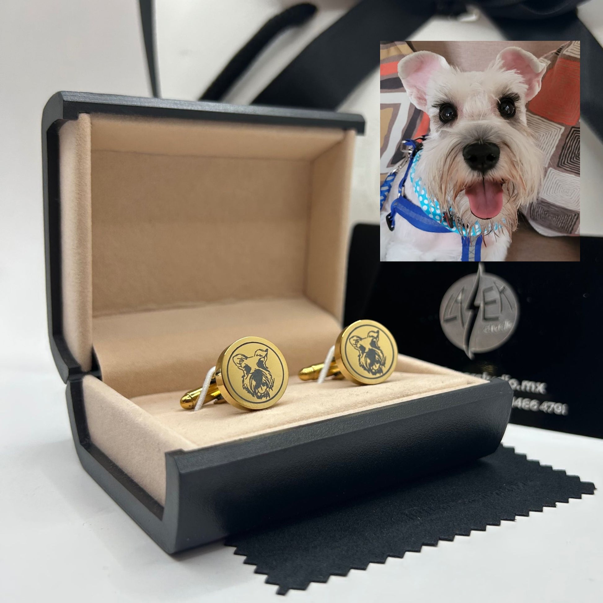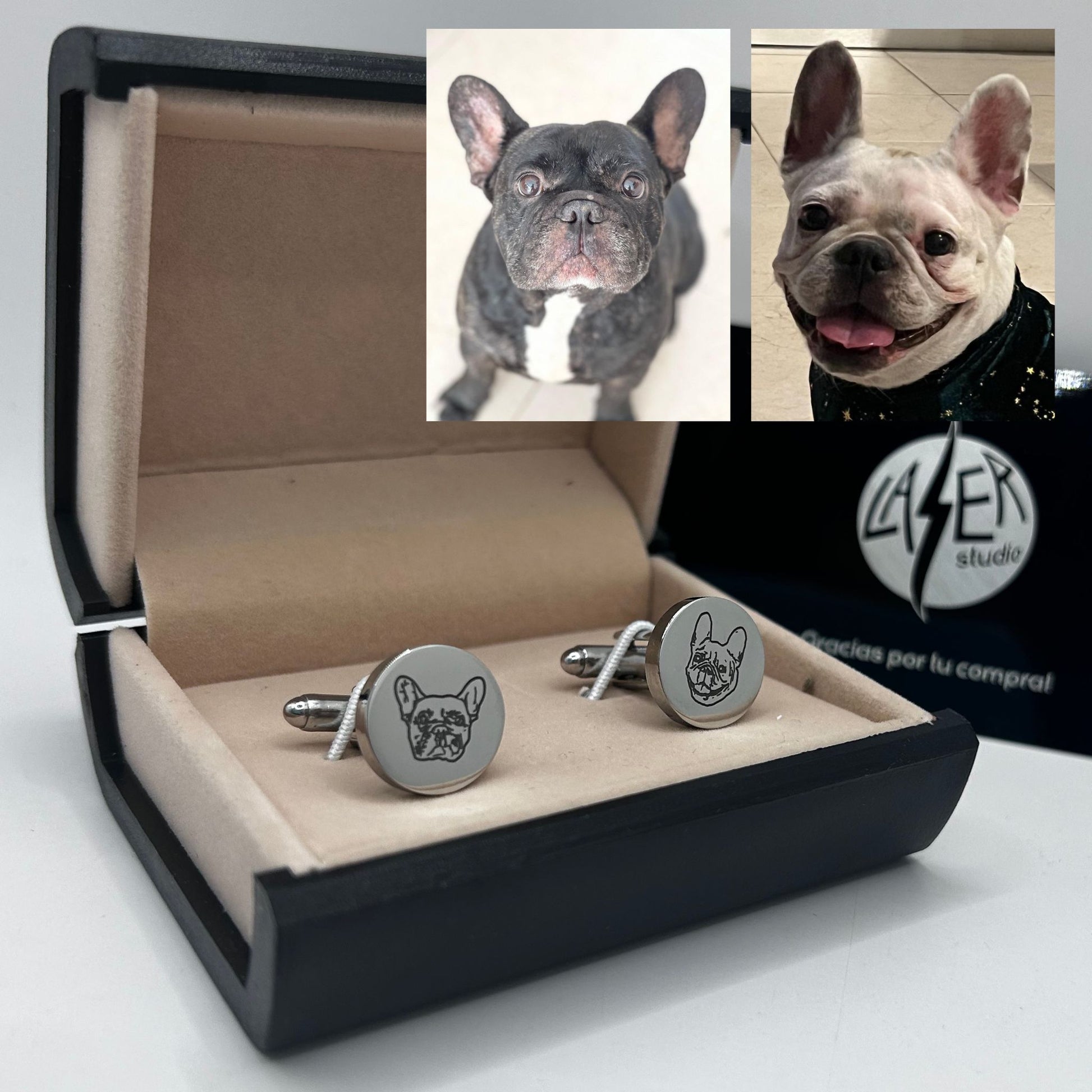 Nuestras mancuernillas personalizadas permiten grabar la imagen de tu perrito con gran detalle y precisión, creando una pieza única, emotiva y elegante en acero inoxidable.