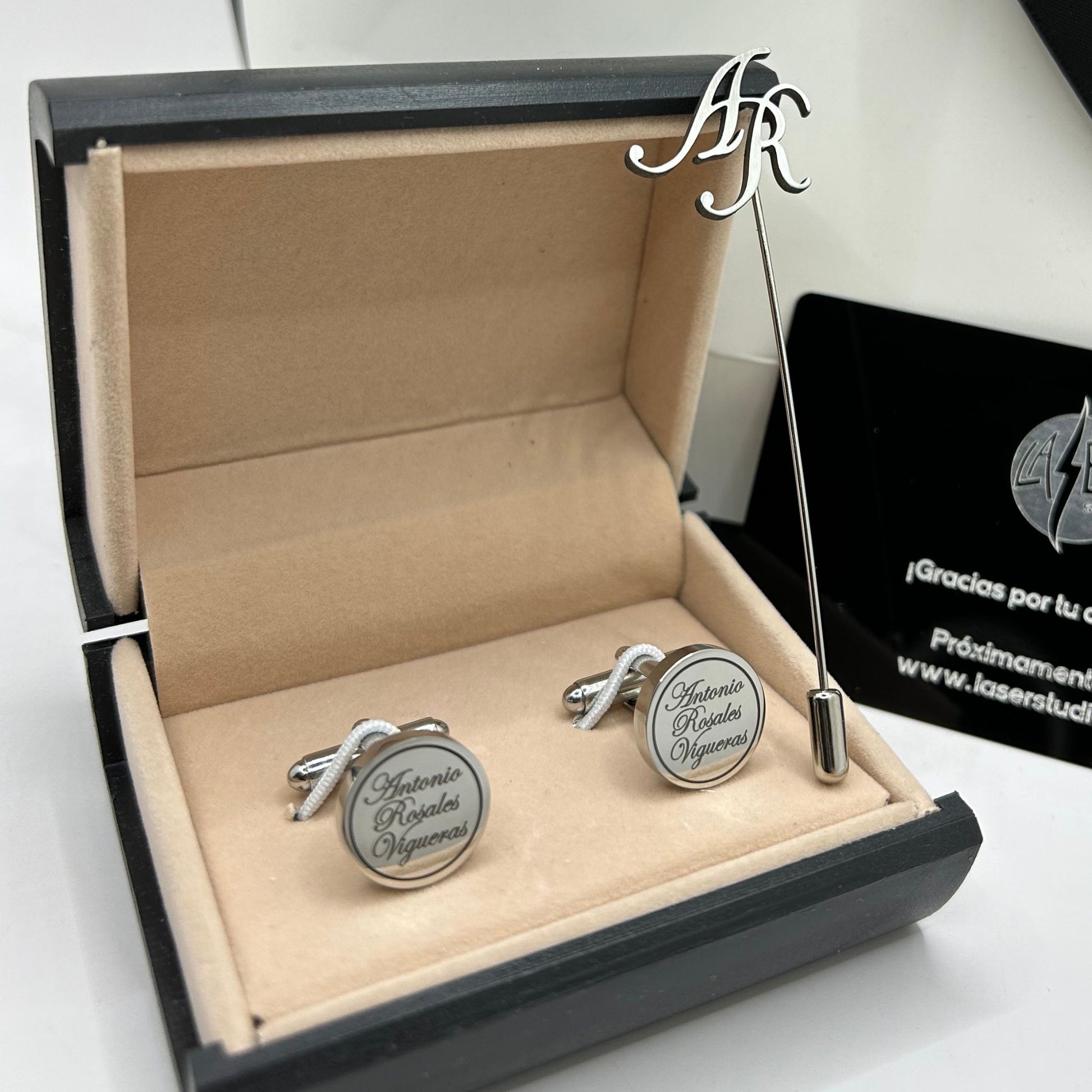 Nuestras mancuernillas personalizadas vienen en un elegante paquete que incluye un boutonnier de acero inoxidable (máximo 3 caracteres, solo en color plateado), caja de almaccenamiento y paño de limpieza. Diseñadas para capturar momentos únicos con un acabado duradero y sofisticado. Personaliza con nombres, fechas, frases cortas o iniciales para crear una pieza única que te acompañe en cada ocasión importante.